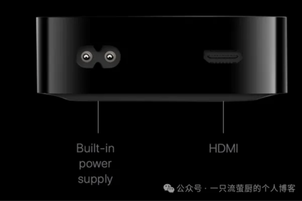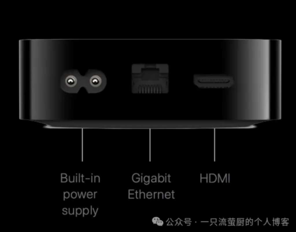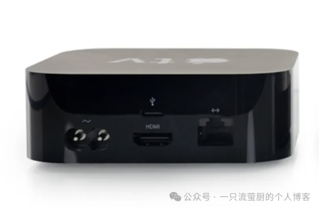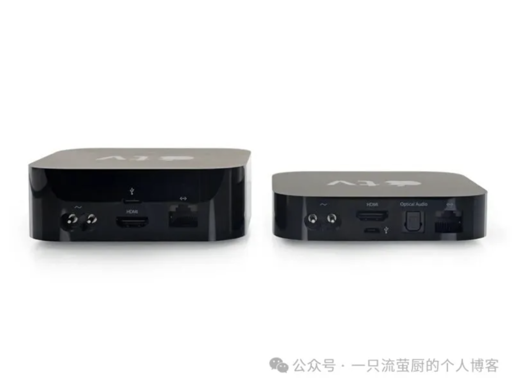 这代Apple TV的外形对比前代变厚了,重量也重了0.3磅,接口方面取消了光纤音频接口,调试用的接口也从Micro-USB变为了type-c(如下图,左Apple TV HD,右Apple TV2、3)