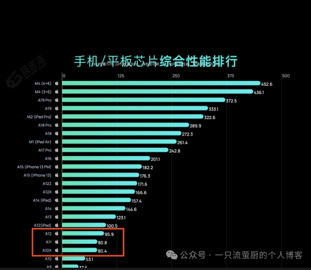 这两款Apple TV在外形上对比Apple TV HD有一些简单的变化,一是从这代开始取消了type-c调试接口,二是从这代开始增加了风扇以及出风口用于主动散热,但是这一设计只沿用了了两代,在最新的Apple TV 4K(第三代)上就取消了,再来说说性能方面Apple TV 4K(第一代)搭载apple自研的A10X处理器,而Apple TV 4K(第二代)搭载apple自研的A12处理器,它们的综合性能在天梯图上是这样的(见下图)