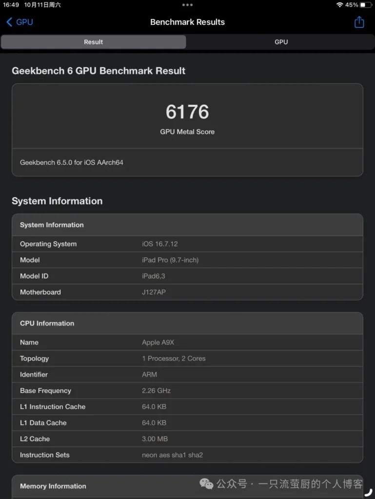 再来看看参数部分,存储一共有三档可选,分别是32G、128G、256G,均标配2G的运行内存(想要4G?出门左拐12.9英寸),当然啦,我自然是选择的是32G,毕竟我的需求不多就是简单的写点东西,其他的有我的那台11英寸的iPad Pro顶着(doge),接下来是屏幕,这台iPad Pro搭载了9.7英寸的LCD屏,分辨率达到了2048×1536 (264PPI),然后我们来看看外设方面,它拥有着4扬声器,音质比现在的部分平板音质还好,甚至还有顶级外星科技3.5毫米耳机孔,后置摄像头虽然只有1颗,但是高达1200万像素你敢信,直逼iPhone13(虽然有点夸张,但是iPhone13用的后置摄像头也是1200万像素的),最后来说说它的性能吧,它搭载了A9X芯片,性能根我的iPhone7P不相上下,不服?跑个分?