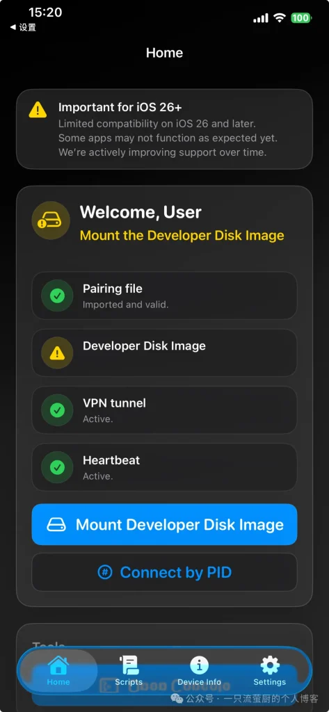 不用担心,我的文件包也准备了解决方案,在文件包中的stikdebug文件夹中有一个DDI.zip的文件夹,把它传输到手机的文件app后在手机中解压,后把这个叫DDI的文件夹移动到StikDebug文件夹中替换即可,回到stikdebug软件中后你就会惊喜的发现,选项全打勾了,接下来我会教你如何正确的打开UTM(有JIT权限),以后都要这样启动!!!
