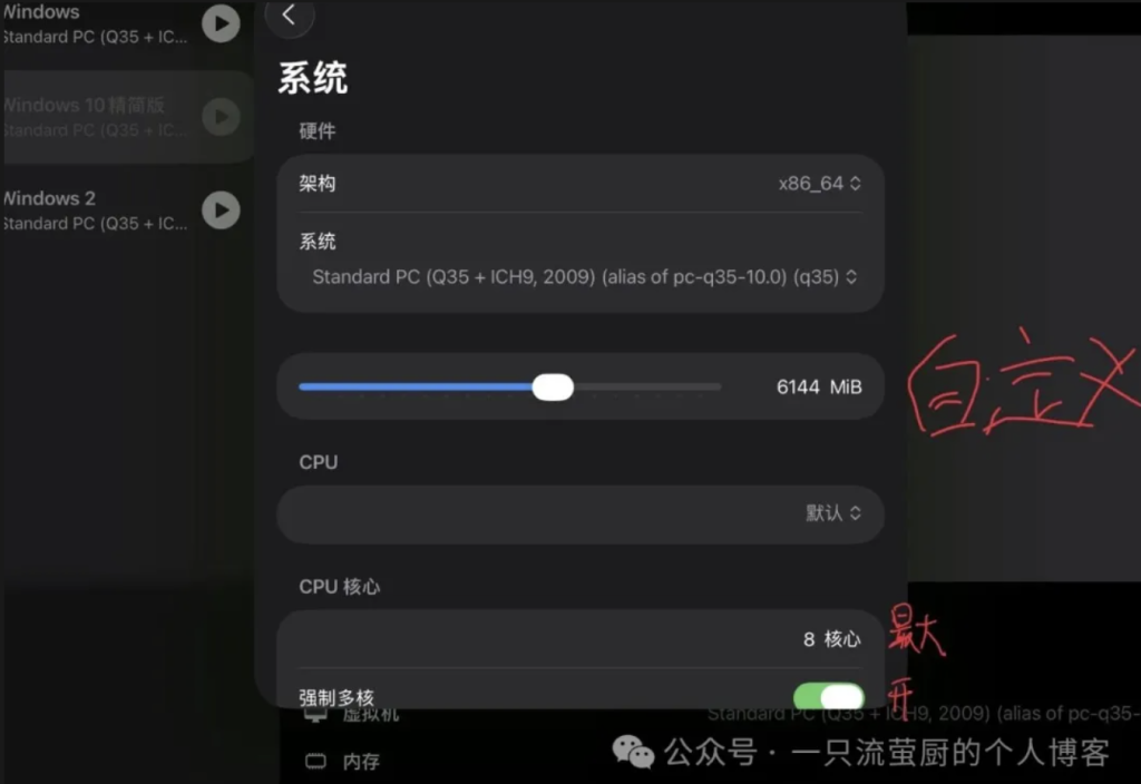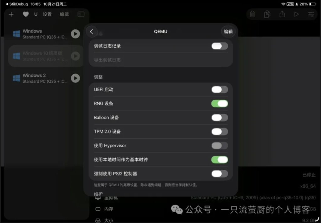 在工具包中找到我准备的镜像后传输到手机上,回到UTM并点击“+”,点击模拟- Windows-虚拟机-(中间那个,x86_64),内存随意,但是最好不要超过你实体机的一半,CPU核心选择最大即可,点击继续后选择刚刚的Windows镜像,并自行选择存储空间的大小,然后一直继续到点击完存储,随后按照下面的图片自定义所有配置,(点击虚拟机页面的设置来调整)